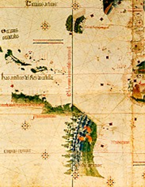 Planisfério com a localização do Brasil, criado em 1502. Este é o primeiro mapa do Brasil. |
